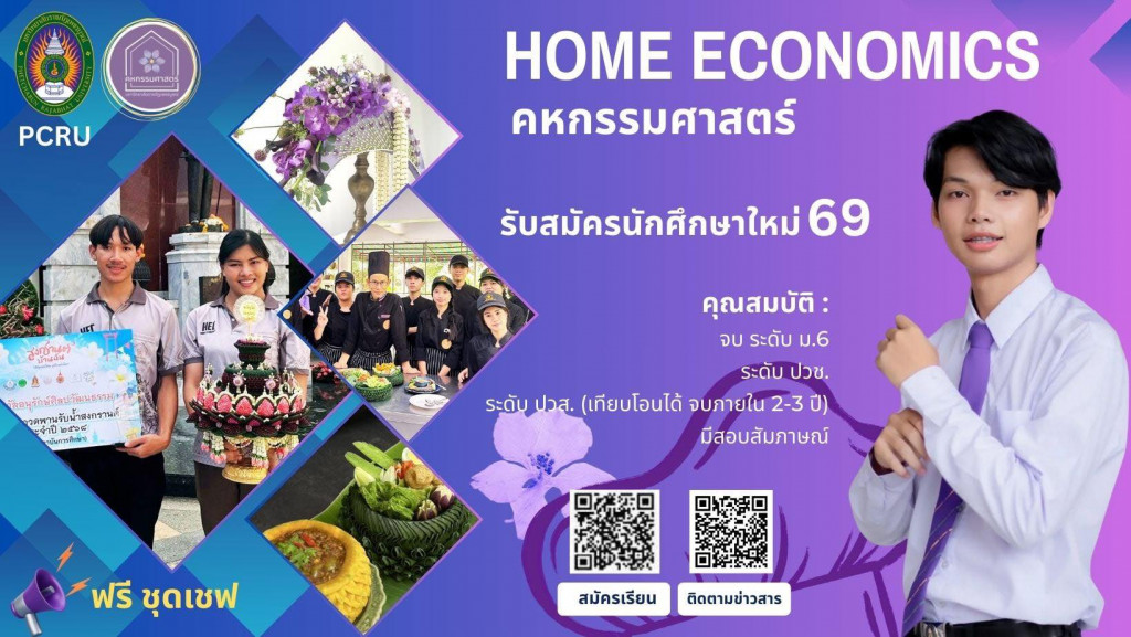 สาขาคหกรรมศาสตร์เปิดรับสมัครนักศึกษาใหม่ 2569มีพื้นฐาน ไม่มีพื้นฐาน ด้านคหกรรม ก็สามารถเรียนได้ ที่ คหกรรมศาสตร์ ราชภัฏเพชรบูรณ์ฟรี ชุดเชฟ ทุกคนที่สมัคร และขึ้นทะเบียนเรียนhttps://academic.pcru.ac.th/admission/ สอบถามโทร 056717119